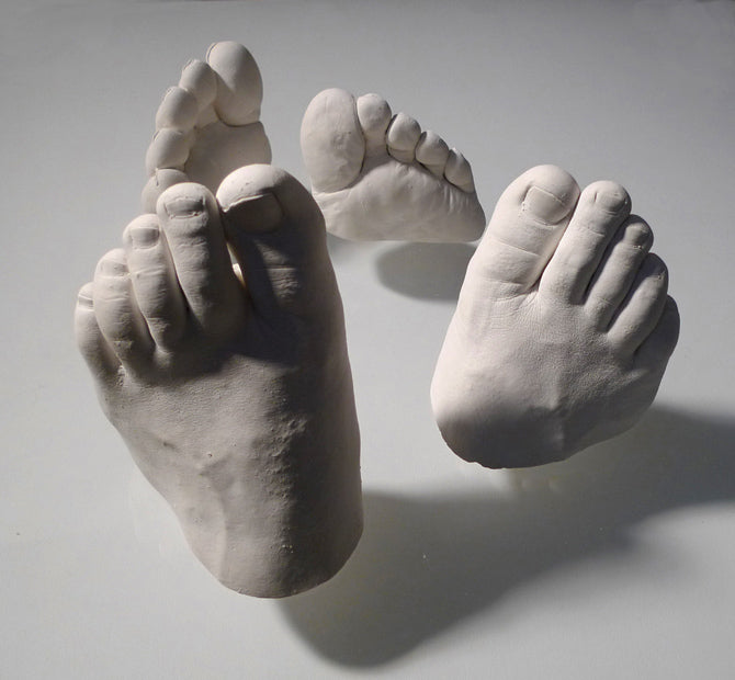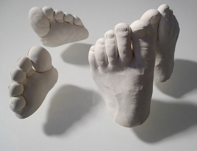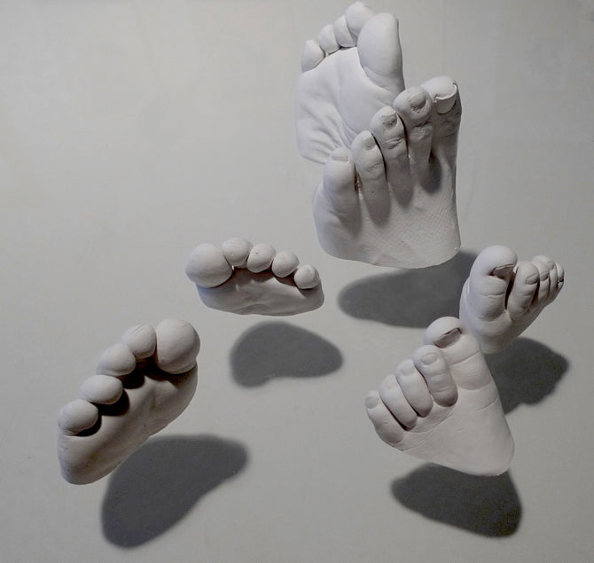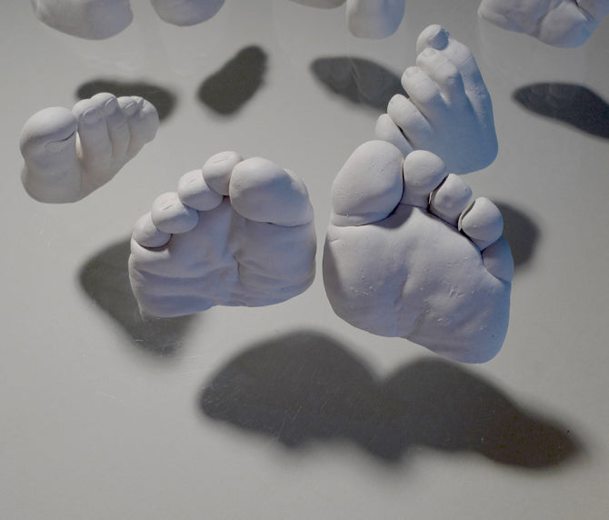**Nearly 100 individuals allowed me to cast one of their feet. The volunteers ranged from 2 months old to 70+, and included both male, female, all occupations, nationalities, and size. I used alginate molds for each foot, and liquistone (plaster and gypsum) was poured into each mold to make the foot casts, which are highly detailed, hyperrealistic representations of the human foot. The feet were displayed on glass which was elevated over a white base, 4 inches above the floor. In this way, the feet appear to float, and also cast interesting shadows which mimic the shapes of pathogens. They were left white to draw attention to the nondiscrimination of pathogens. Regardless of age, race, occupation or religion. We are all equally vulnerable to the invisible microbe.