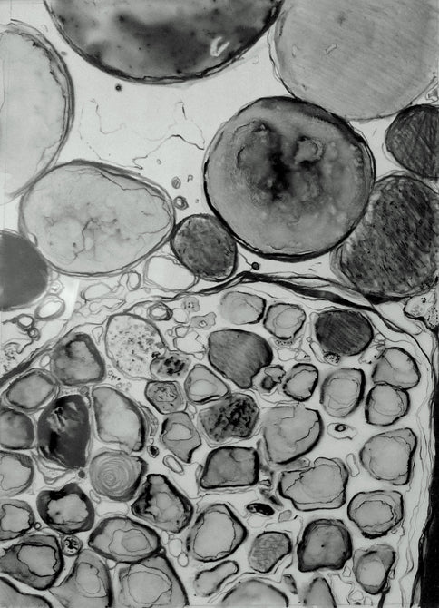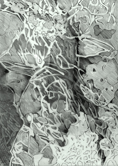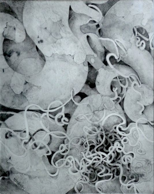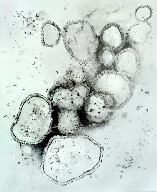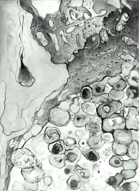 *** All the drawings in this exhibition were done on a ground glass surface. This surface is obtained by rubbing two pieces of glass together with carborundum and water until they are evenly textured. Several of these drawings are multi-layered, with one to two additional drawings on mylar beneath the glass plate. I did this to create a sense of depth.