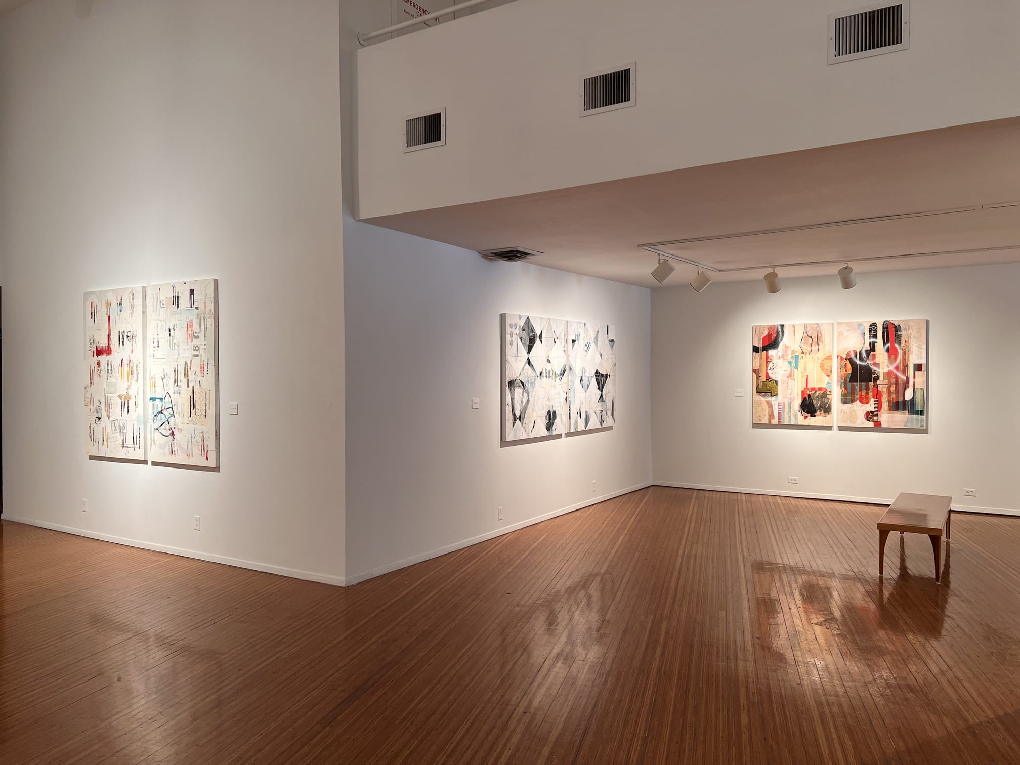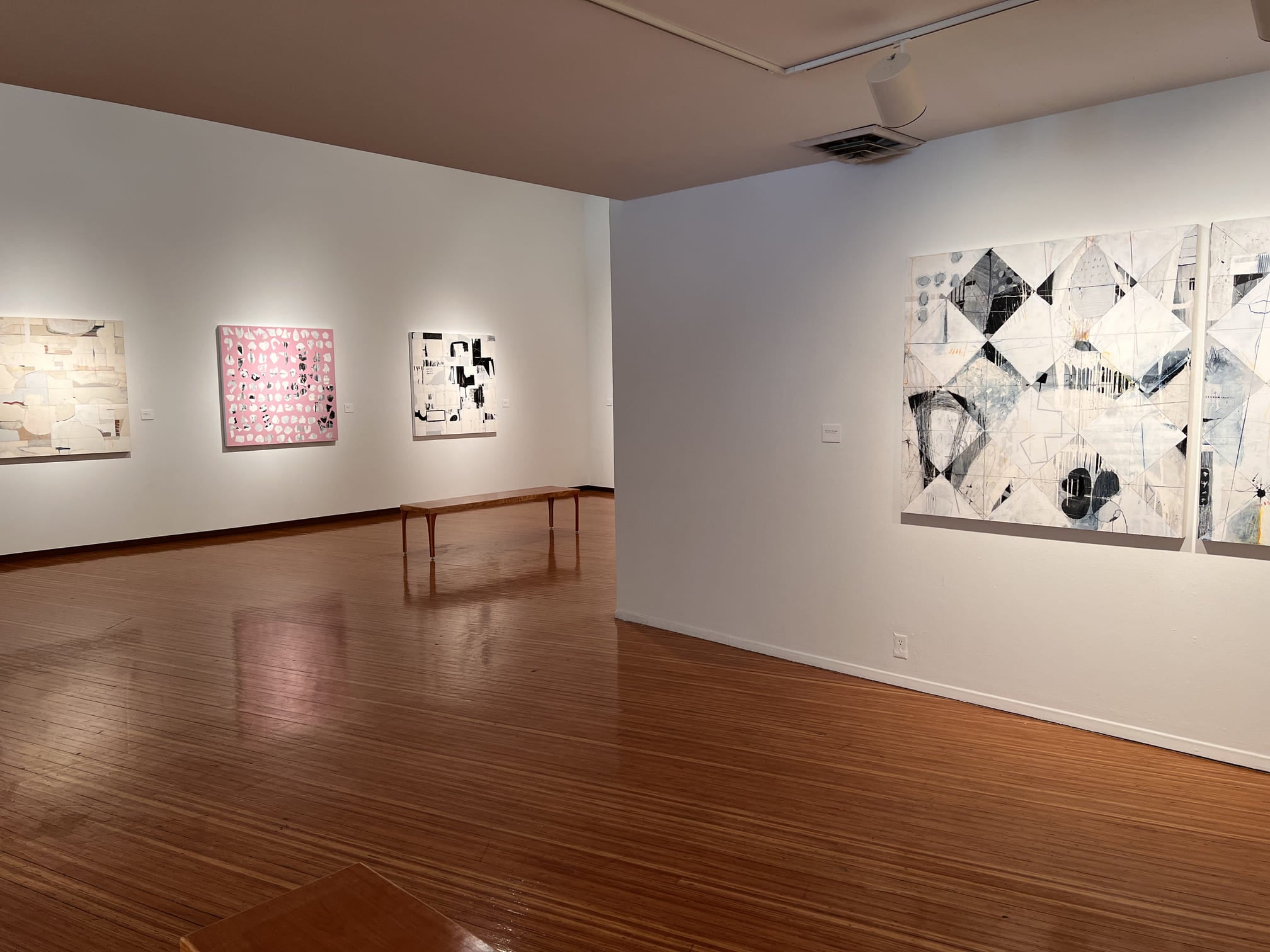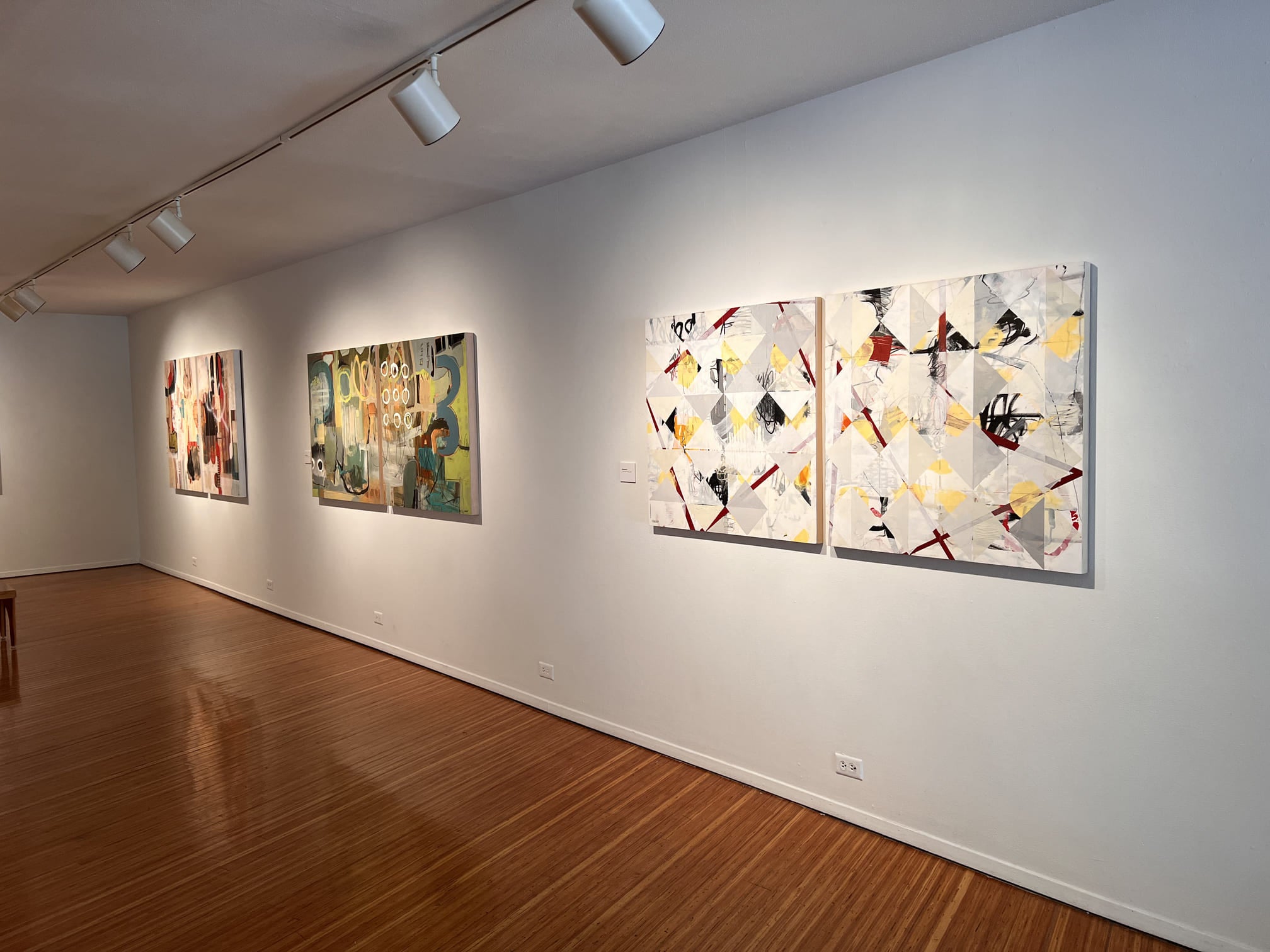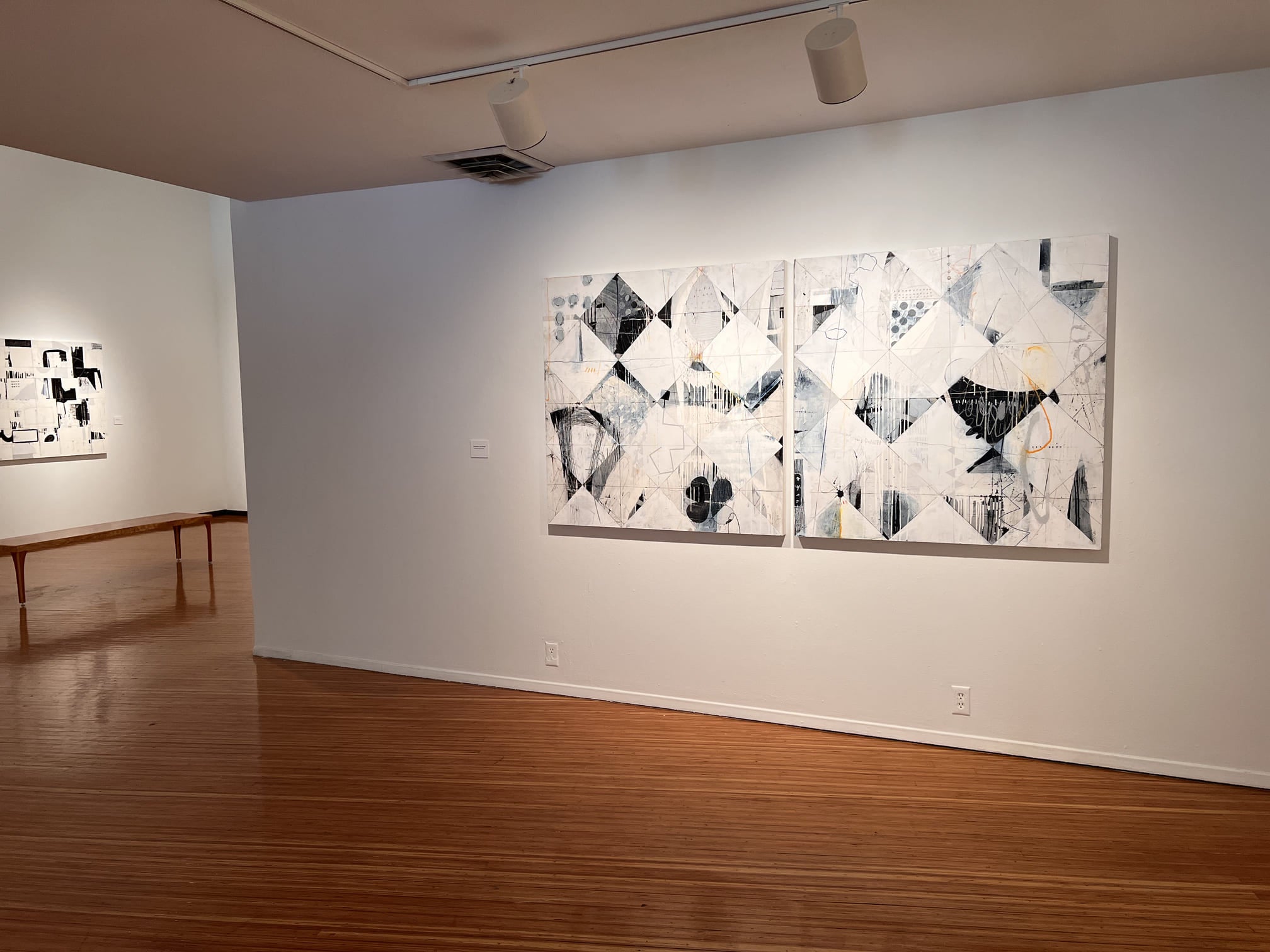 The pandemic created great uncertainty as well as new opportunities. Art for me has become highly experimental and a way to explore cause and effect. The contrasts of chaos and order are constant, and they battle until one wins. Rampant black and white marks are tamed by a layer of solid pink in Undercurrent, whereas energetic looping gestures sporadically skip across four panels in Continuity. My visual language results from a spirit that does not rest or find quiet easily. It is often unsettled and seeks peace amidst calamities. Bits and pieces of the world fray and border on collapse. The birth of two beautiful grandchildren, our loving family, a ripening fig tree and chirping quail keep me balanced in a joyous place. The back and forth, chaos and calm, structure and surprise lead me to this place where life itself is Unforeseen.
