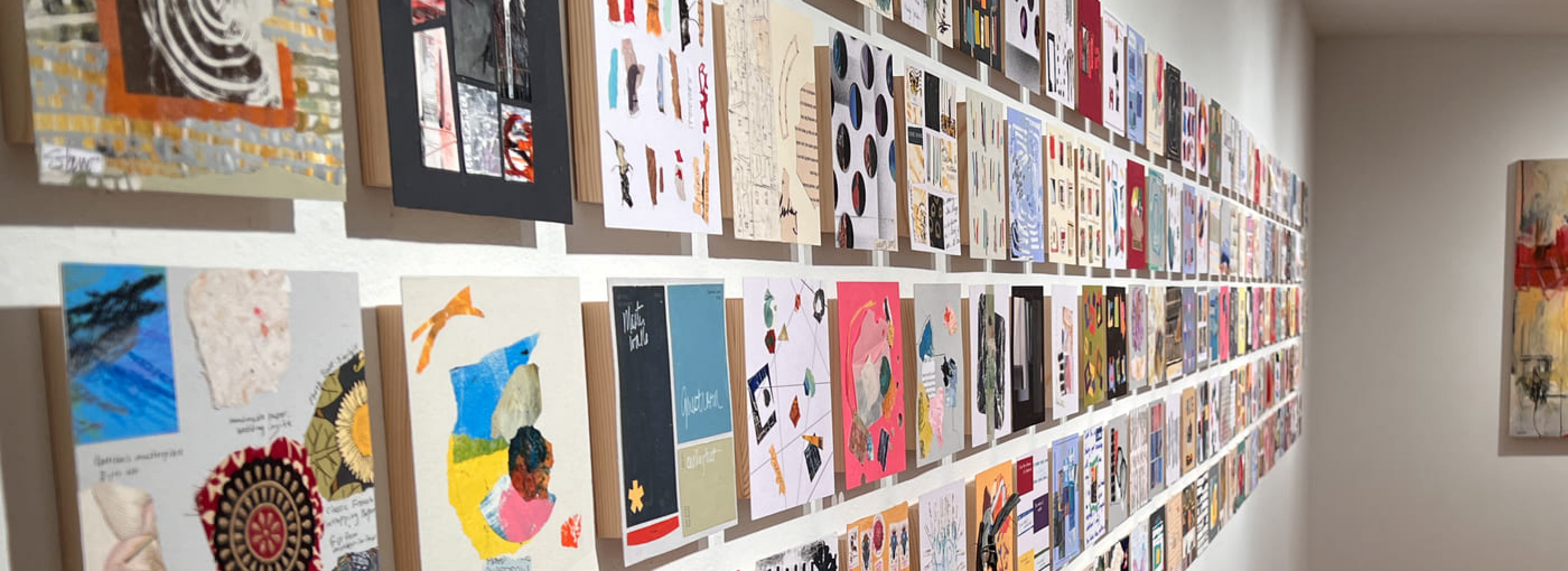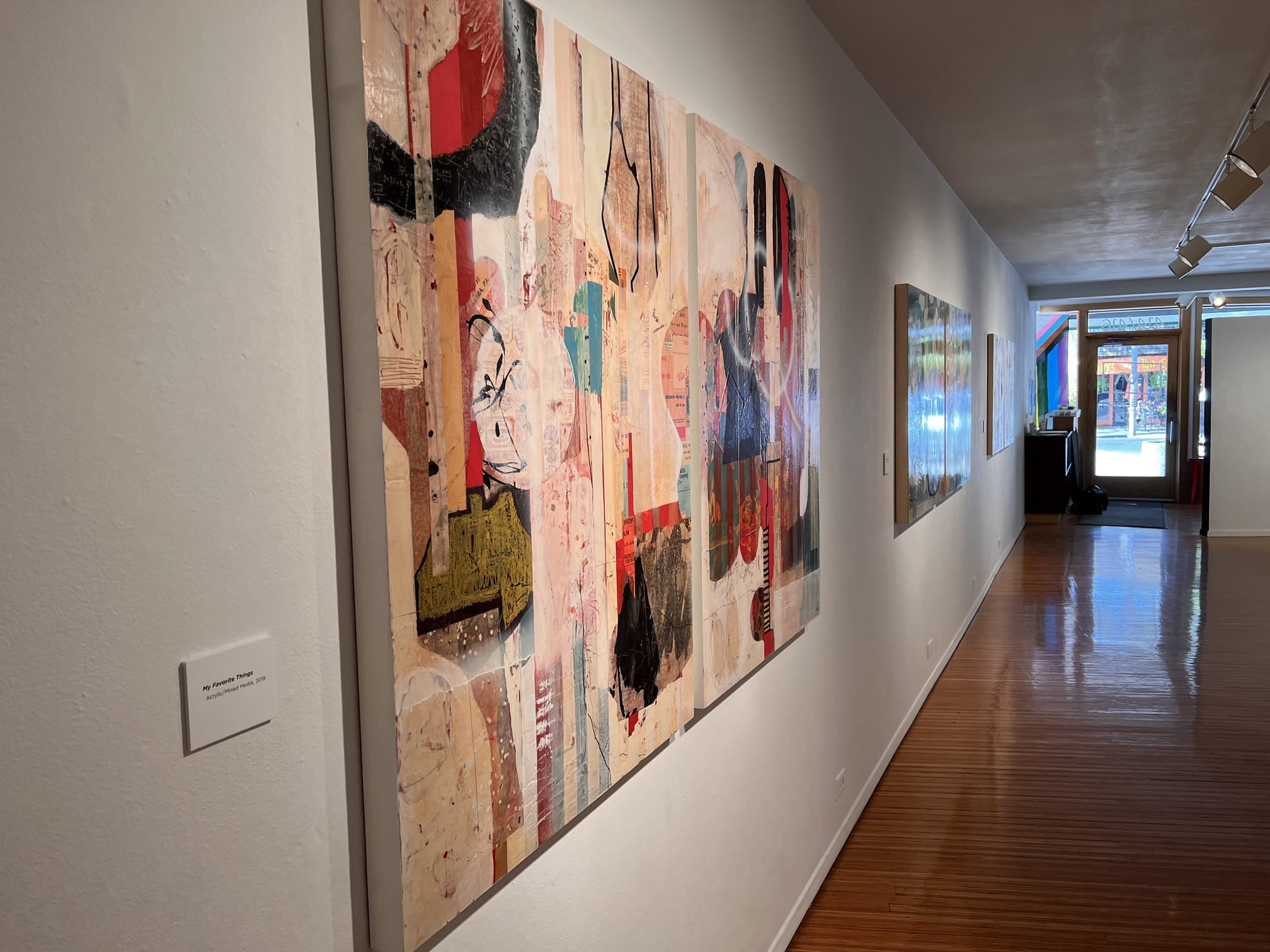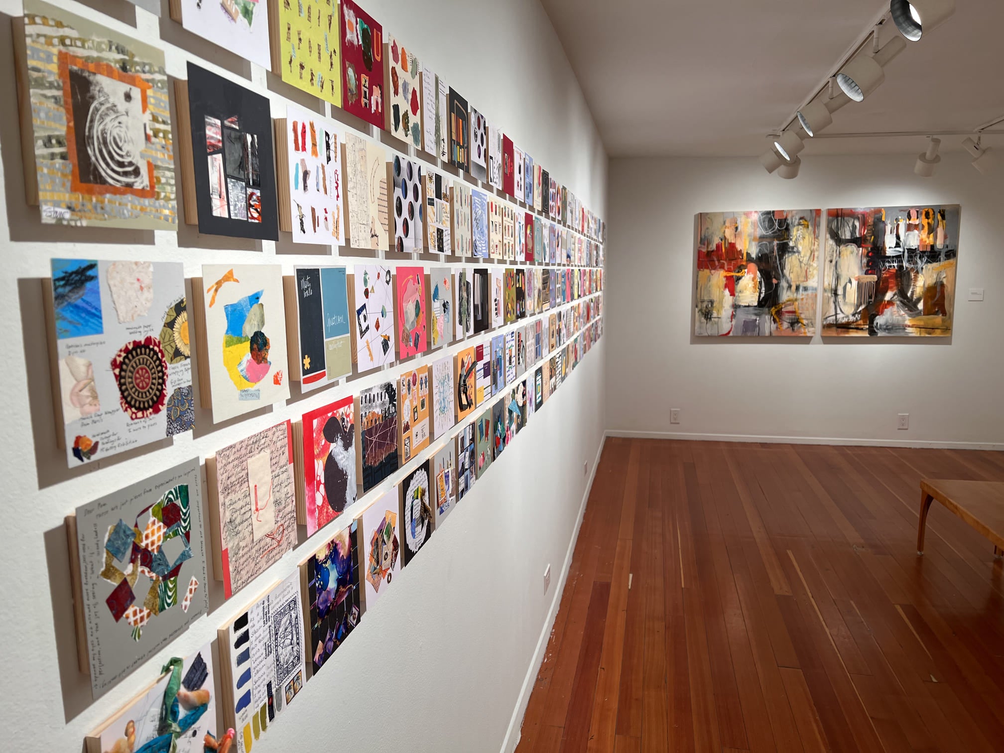 After attending an oil painting workshop in Mineral Point, Wisconsin as a student, I was asked to return as an instructor. Teaching there motivated me to hone my creative skills. Pandemic challenges and necessities further inspired my online teaching platform. I now have students from around the world, and created the Snail Mail Project to engage these global artists in my Pro membership group. I asked my students to send me color swatches through the postal service. Each envelope and its contents led to more than 150 collaborative works of art, many of which are on display in this show.