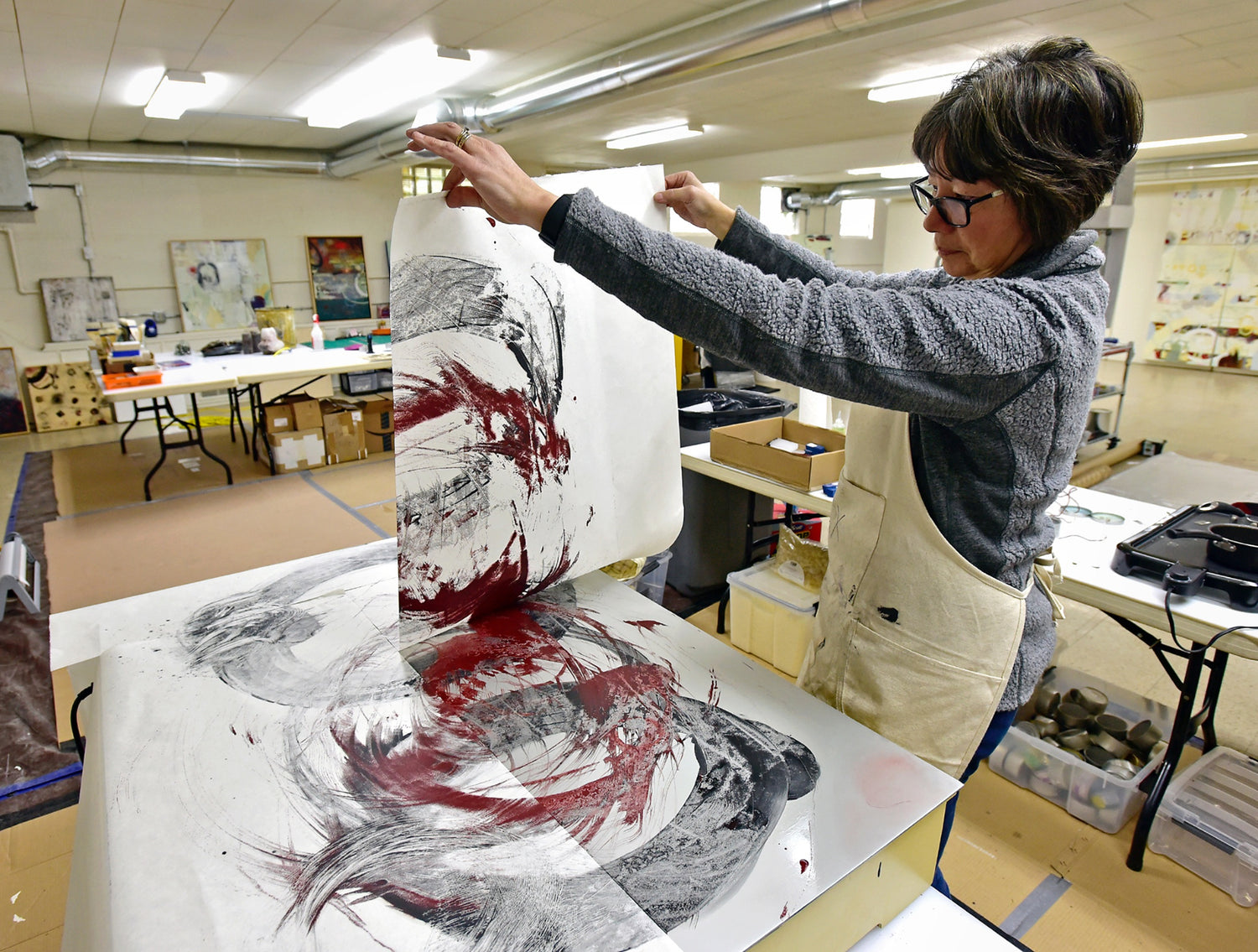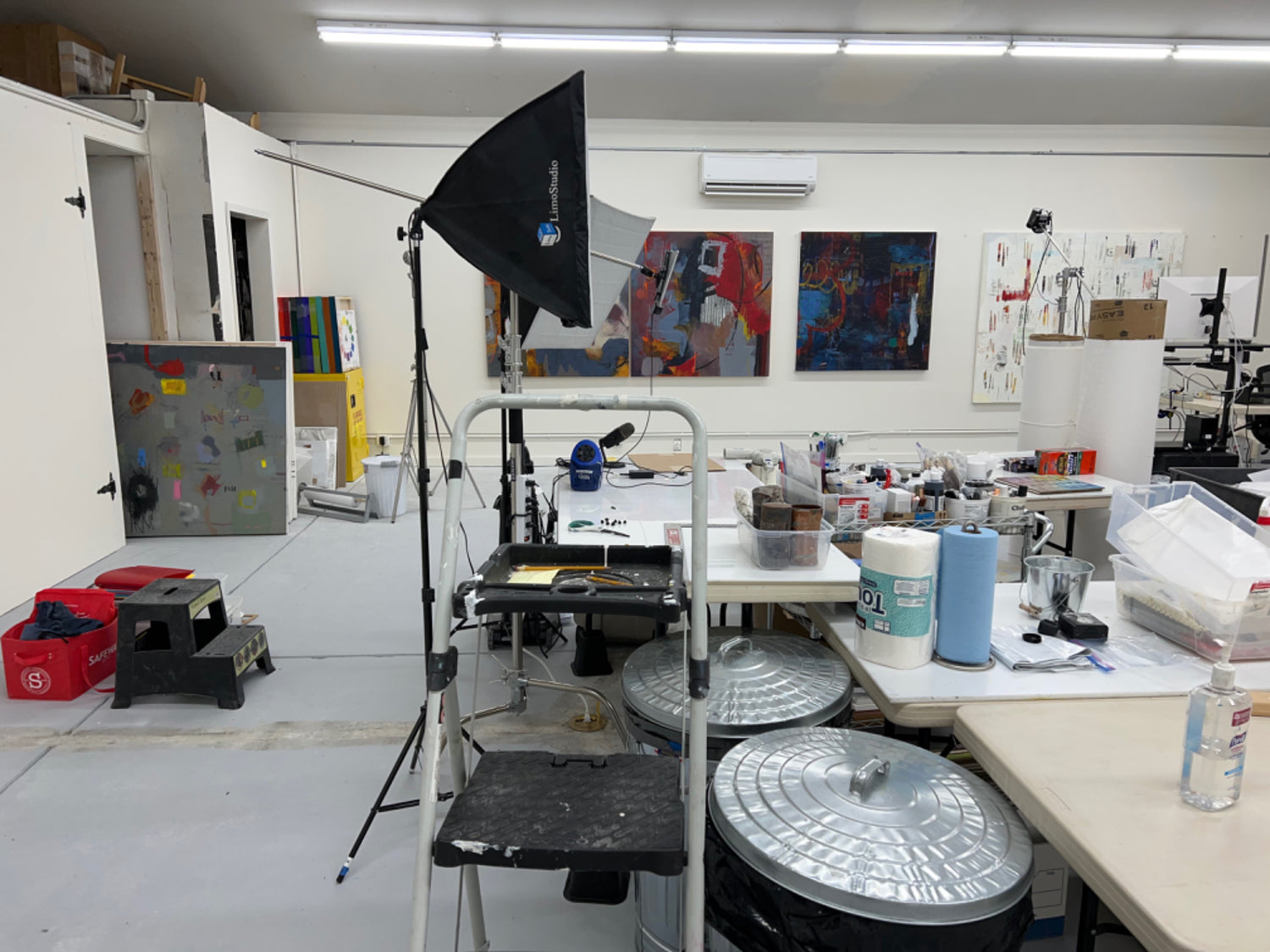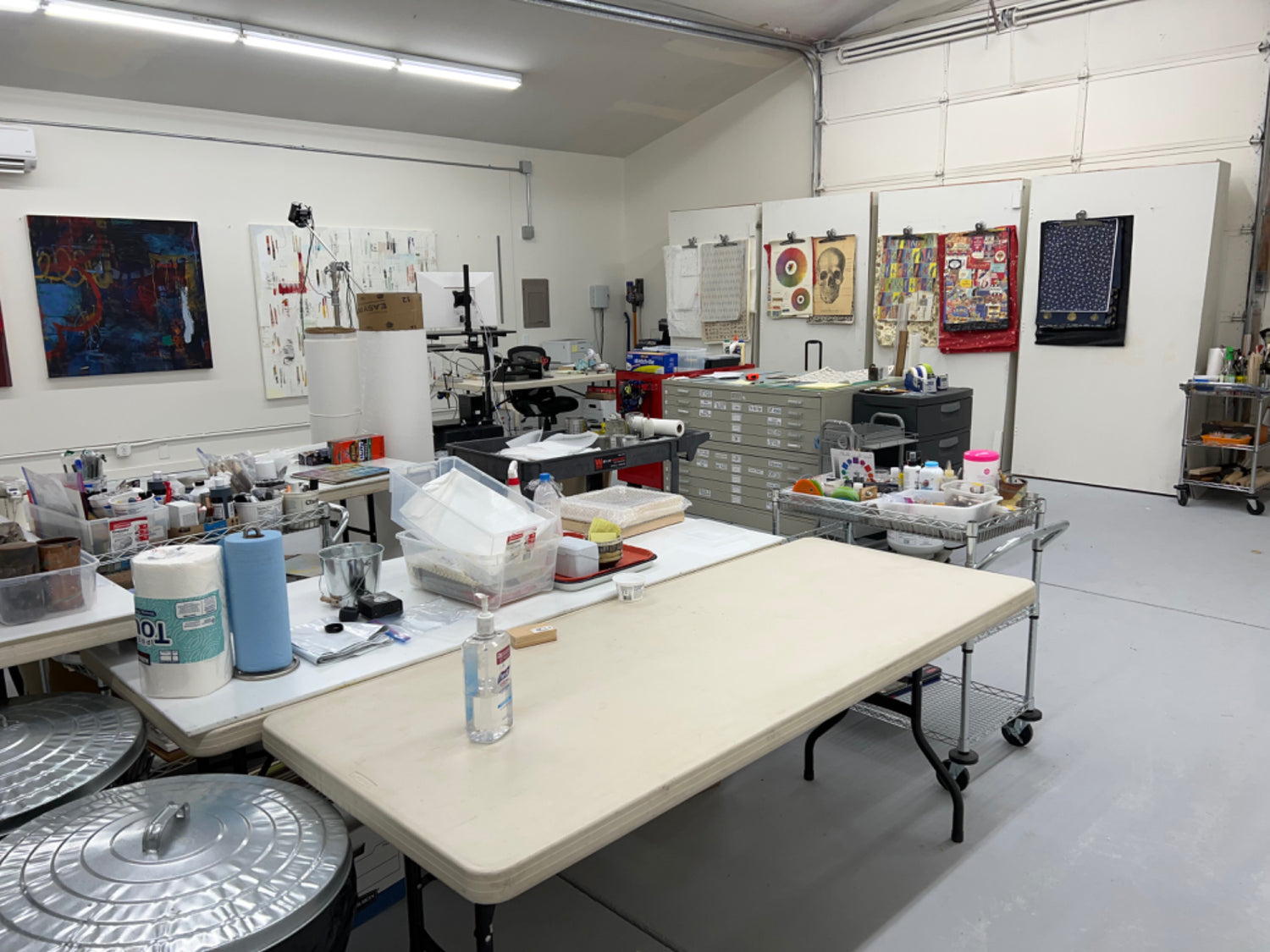CURRENT STUDIO: I now work from my 1000 sq ft studio located at our home. It has ventilation, daylight corrected fluorescent lighting, large wooden walls to hang cradled panels or large sheets of paper, and GFCI (Ground Force Circuit Interruptor) outlets to prevent overloading electrical circuits while painting with encaustic or encaustic monotype. My studio is also equipped with a Roland Pro Box (32x44in) for encaustic monotypes.